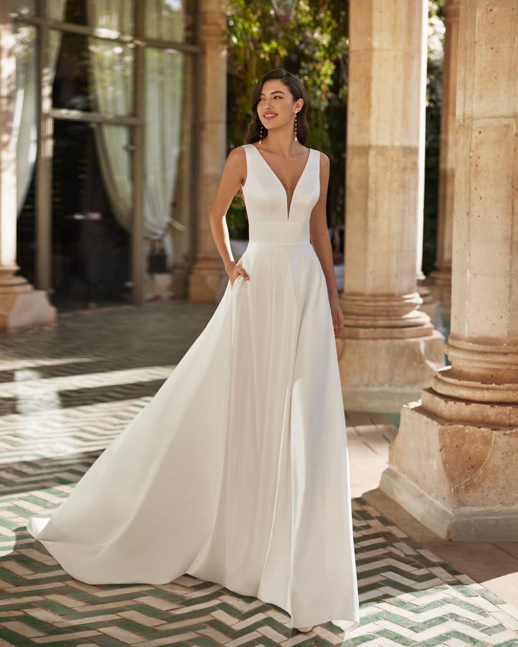 Vestido de novia clásico de corte A, confeccionado en satén. Este delicado diseño de Adriana Alier presenta escote en V, espalda tipo corsé y falda con bolsillos.
