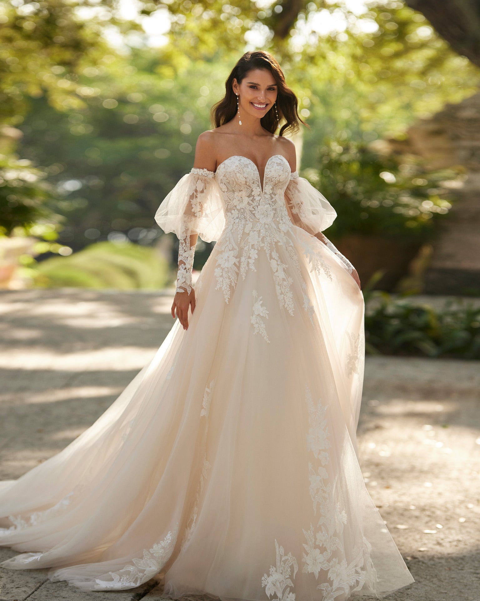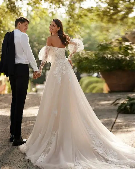 Vestido de novia linea A, realizado en tul y enriquecida con encaje y pedrería. Escote palabra de honor, espalda descubierta y mangas extraíbles y opcionales