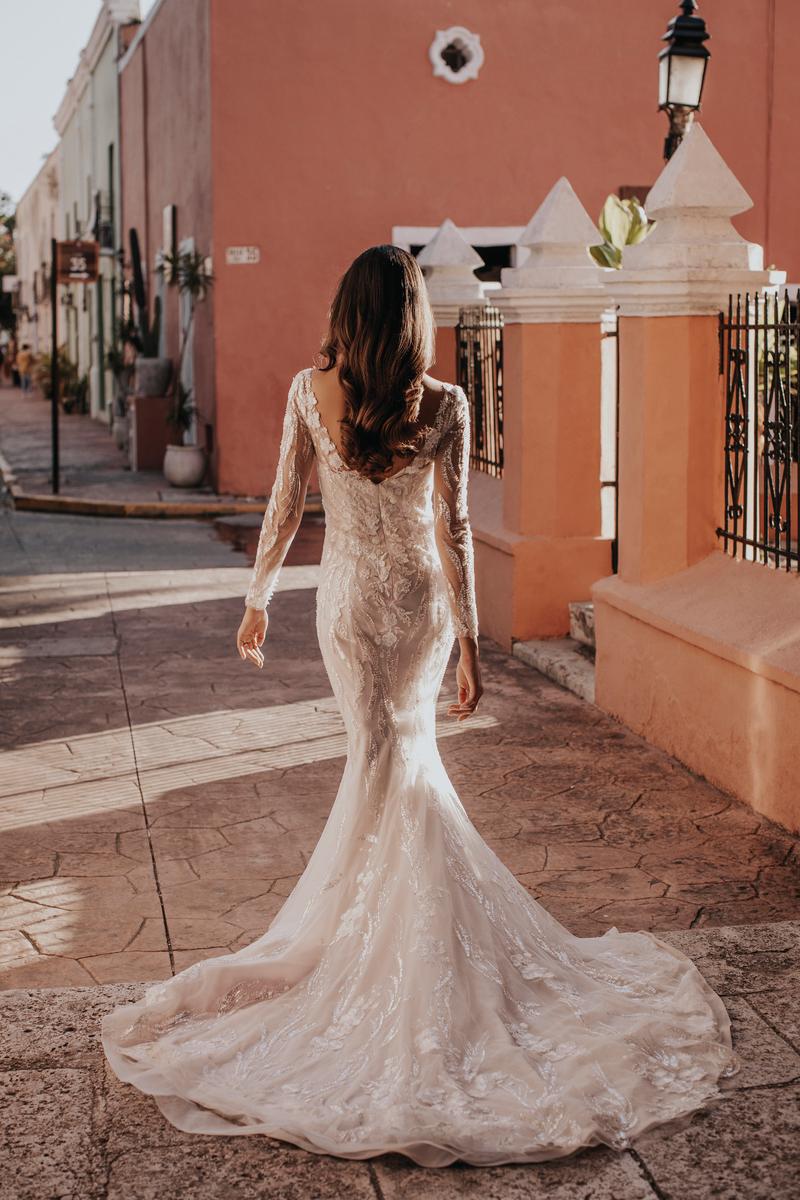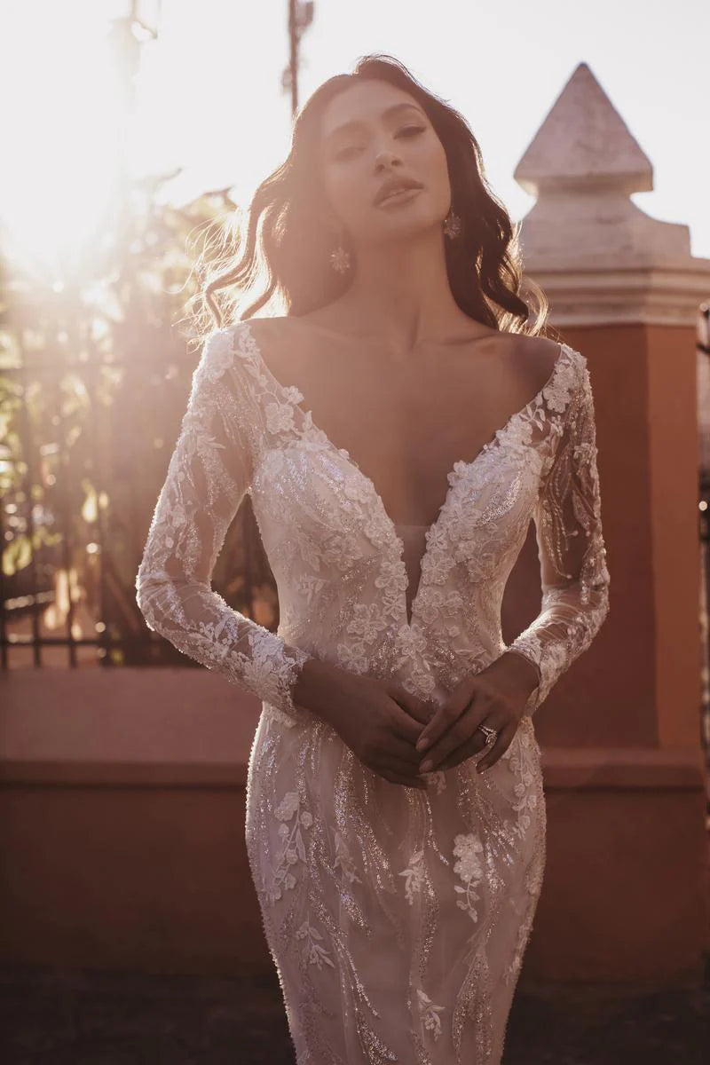 Vestido de novia elegante de manga larga que todas buscamos. Con su impresionante corte tubo y escote pronunciado, es la elección perfecta para tu boda formal o para un look nupcial invernal.