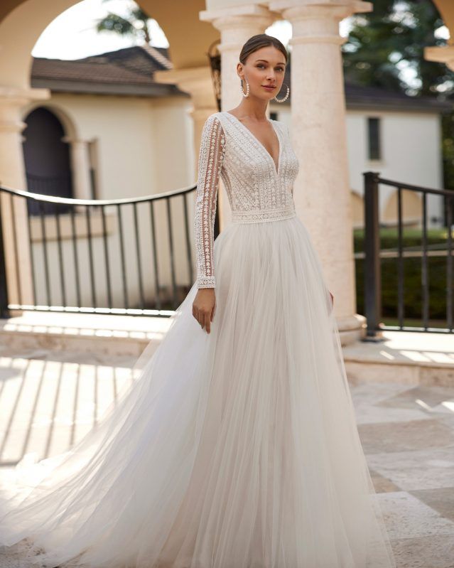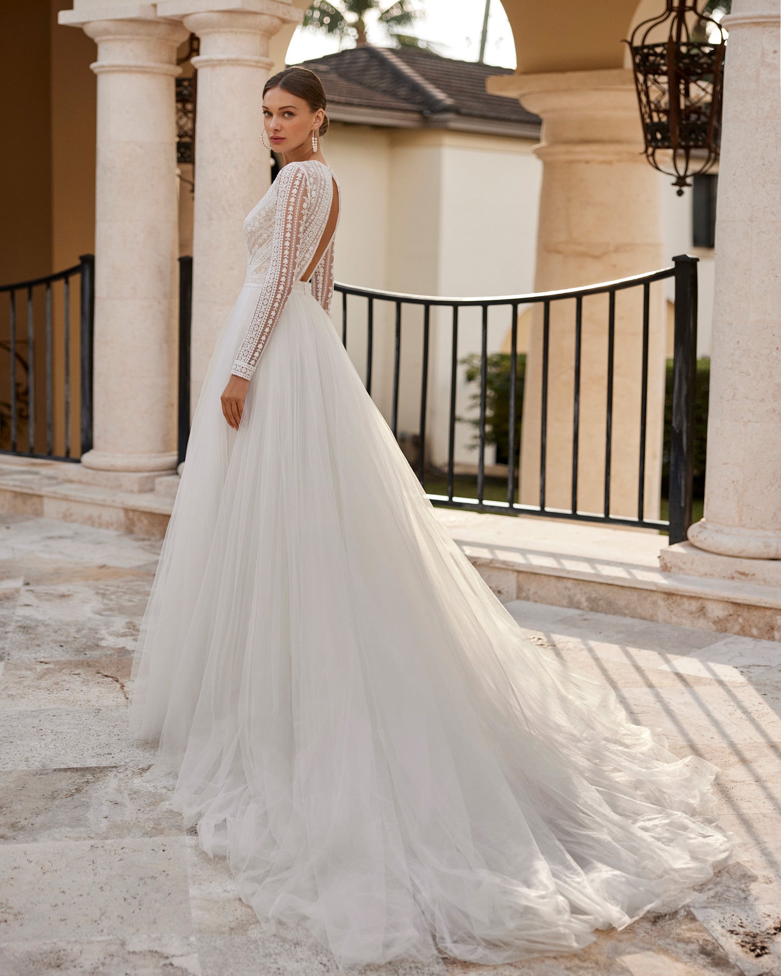 Vestido de novia, de corte princesa y estilo romántico. Confeccionado en tul combinado con encaje pedrería. Con escote profundo y espalda escotada, manga larga de encaje.