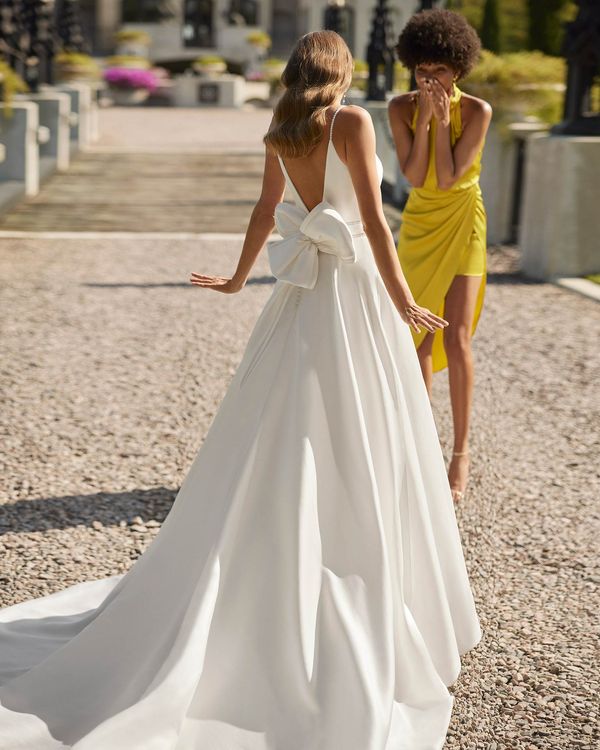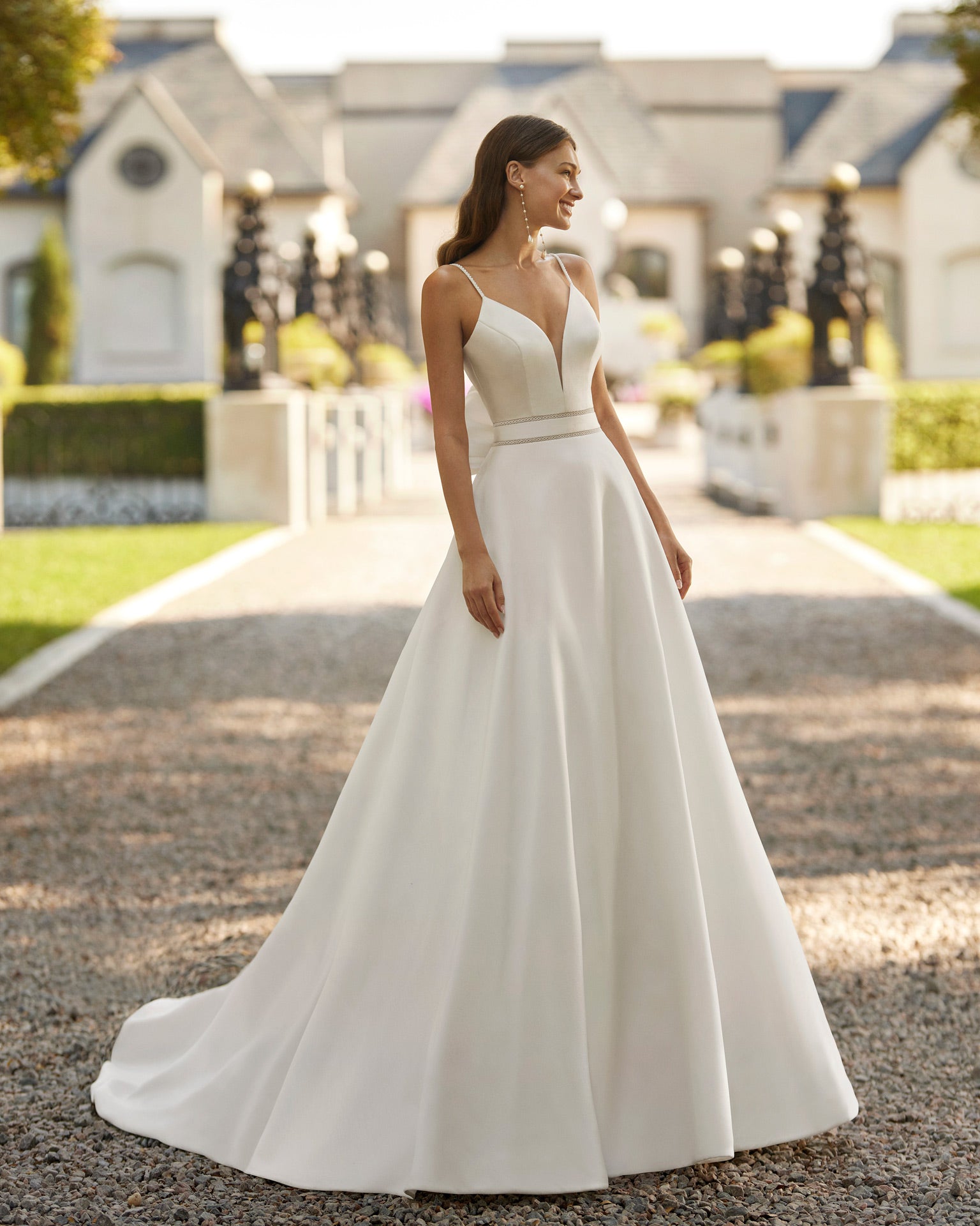 Vestido de novia largo, corte linea A. Con escote profundo, confeccionado con detalle en pedrería en sus tirantes, y su delicada espalda en V, finalizando con un elegante chongo.