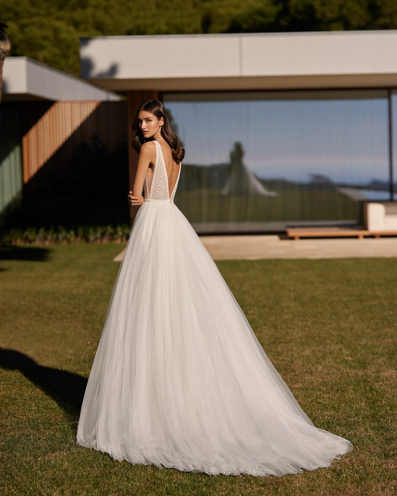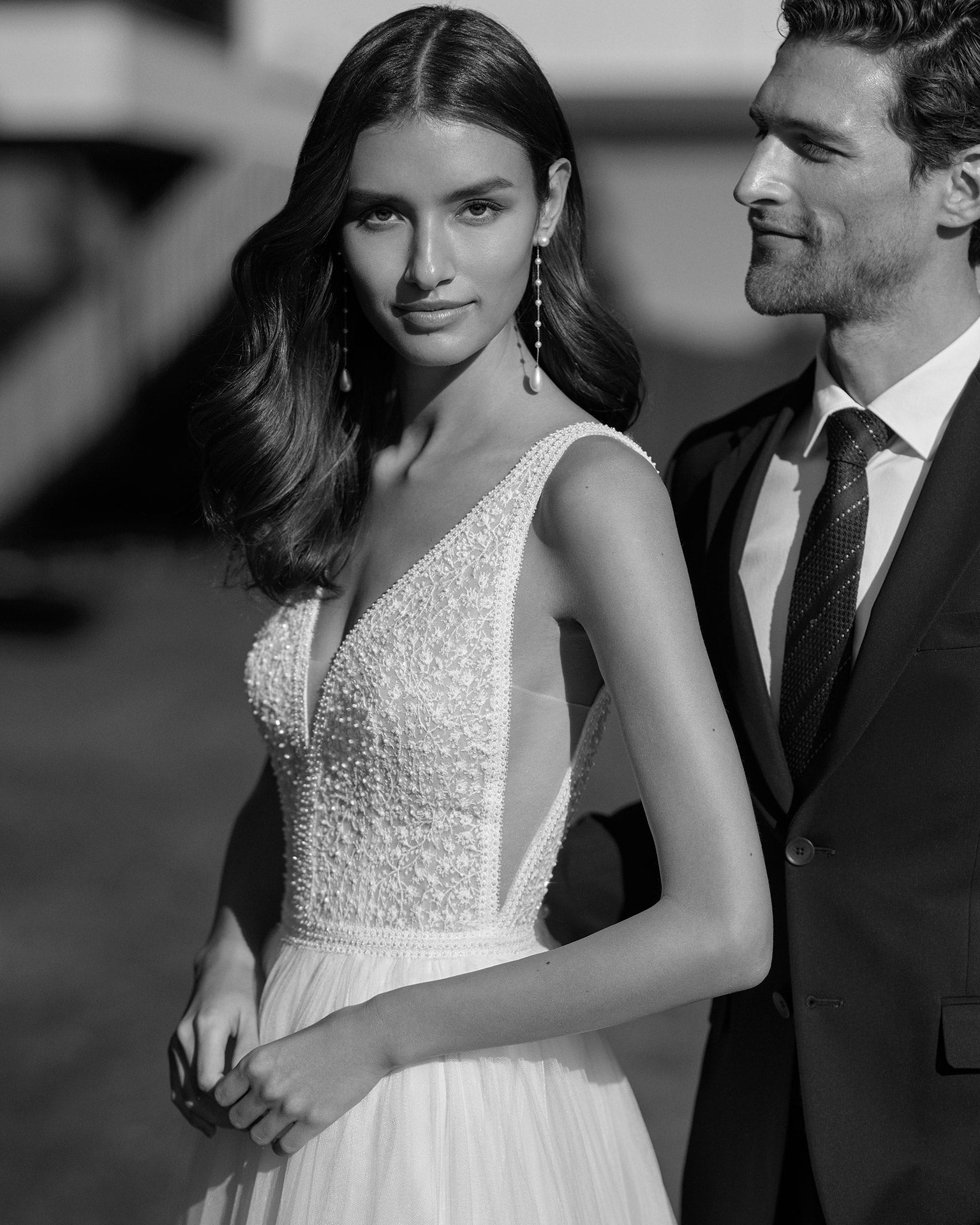 El corte recto confiere a la mujer que lo luce una comodidad absoluta con la que bailar hasta el amanecer y combina de maravilla con el escote en V y un encaje romántico. Este traje de tirantes con espalda descubierta y detalles transparentes en los costados acaba con una maravillosa falda de tul en color natural que cae con gusto desde la cintura y una larga cola.