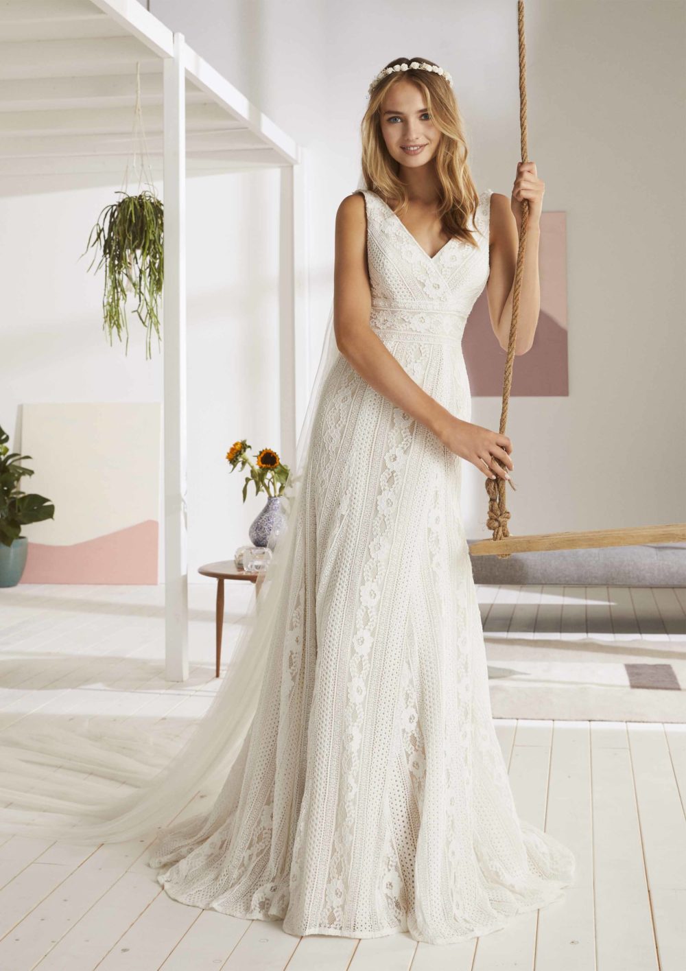 Descubre el encanto de este vestido de corte evase confeccionado en encaje y gasa ondulante. Luce un escote corazón muy favorecedor, una preciosa capa de encaje sobre el cuerpo y una vaporosa cola capilla.