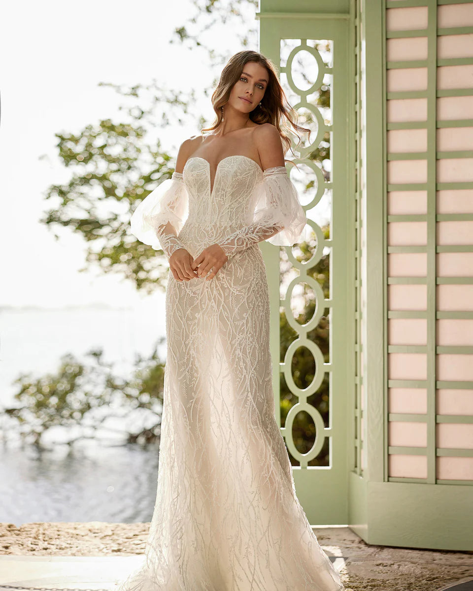 Sensual y brillante vestido sirena, con escote corazón profundo, manga esponjosa desmontable y sobrefalda de gasa.