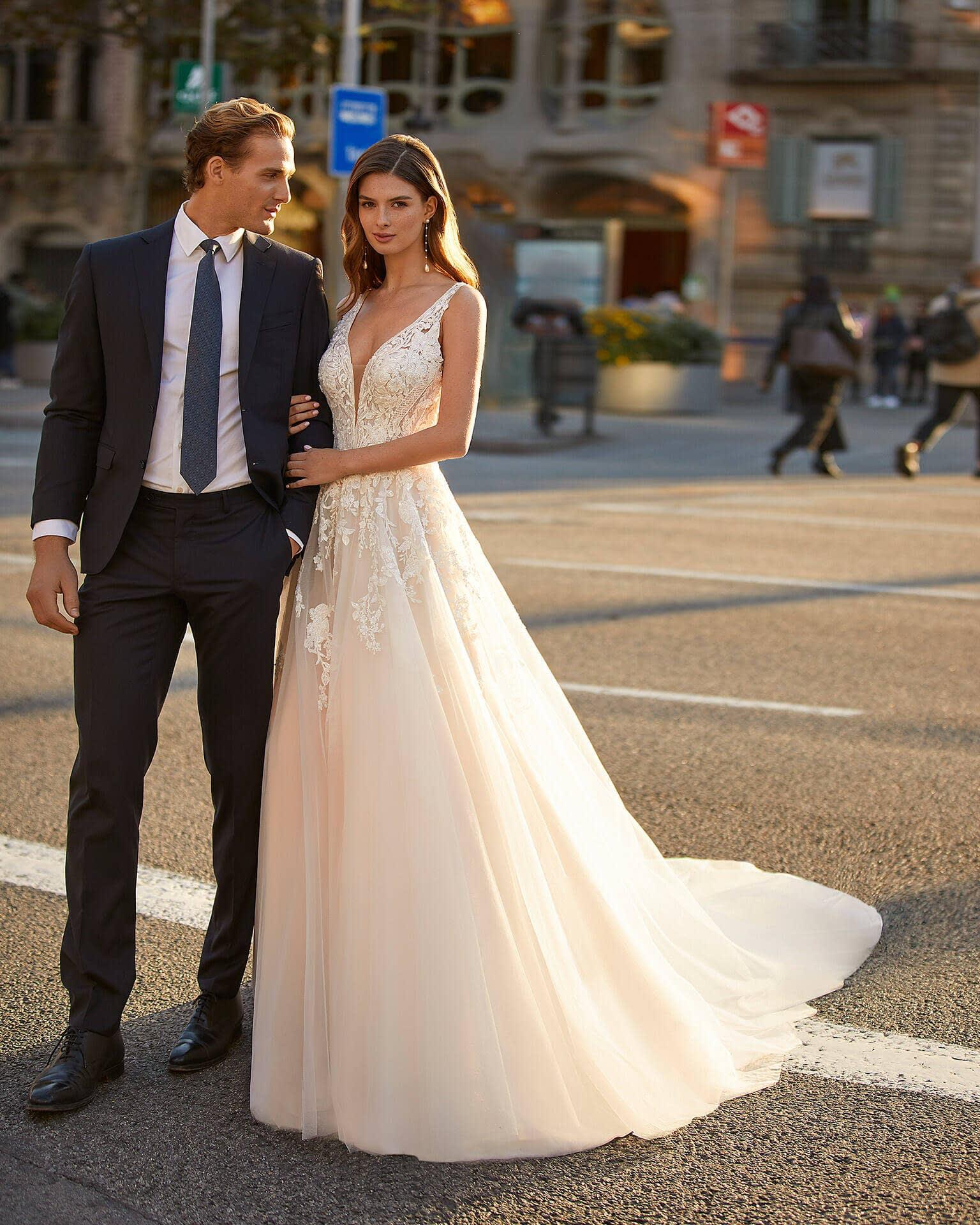 Vestido en corte princesa top con encaje y falda en tul, con espalda semi transparente, escote en V, tono romántico